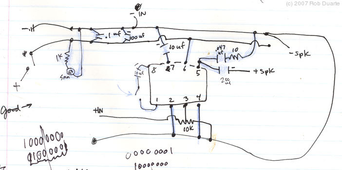 I made the amplifier from an LM386 and I used some of the guts that were leftover in the Hit Guitar case as well – the power/volume switch, the power LED, the “Hit Button” and a couple of the passive components. The Hit Button changes the gain from 20 to 200.