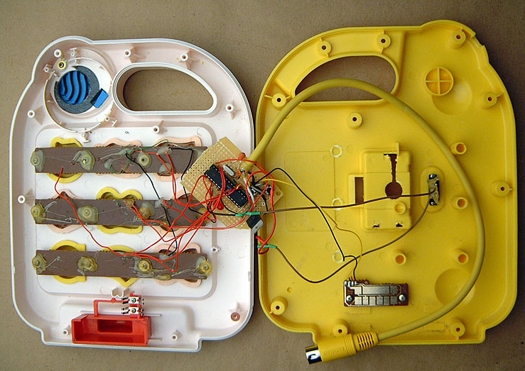 Anyway, I ripped the guts out of this toy and replaced them with my own guts. Said guts include an Atmel AVR microcontroller containing a program that I wrote to make this do what it does. What it does: You hit one of the 9 buttons and a MIDI drum message is sent to a MIDI device of your choosing. Each of the buttons has its own drum sound, but the beauty of this thing is the “Setup” mode: