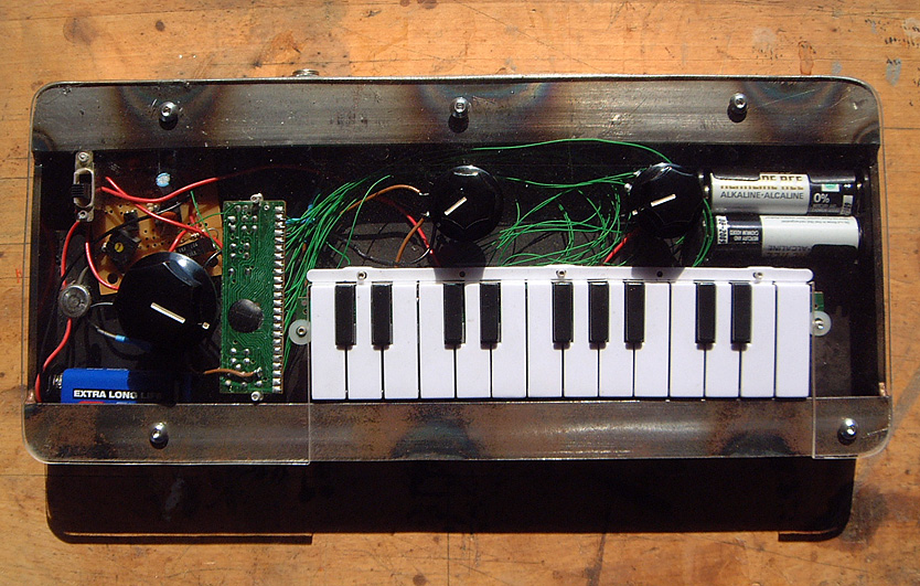 I made this keyboard from a $1 toy that I bought at Savers. I made some changes to the electronics including pitch control, a 555 timer circuit that adds extra resistance in secret places, a speed control for the timer, 1/4″ output jack, and a touch-contact for good measure. I fabricated the case from cold-rolled steel and acrylic.