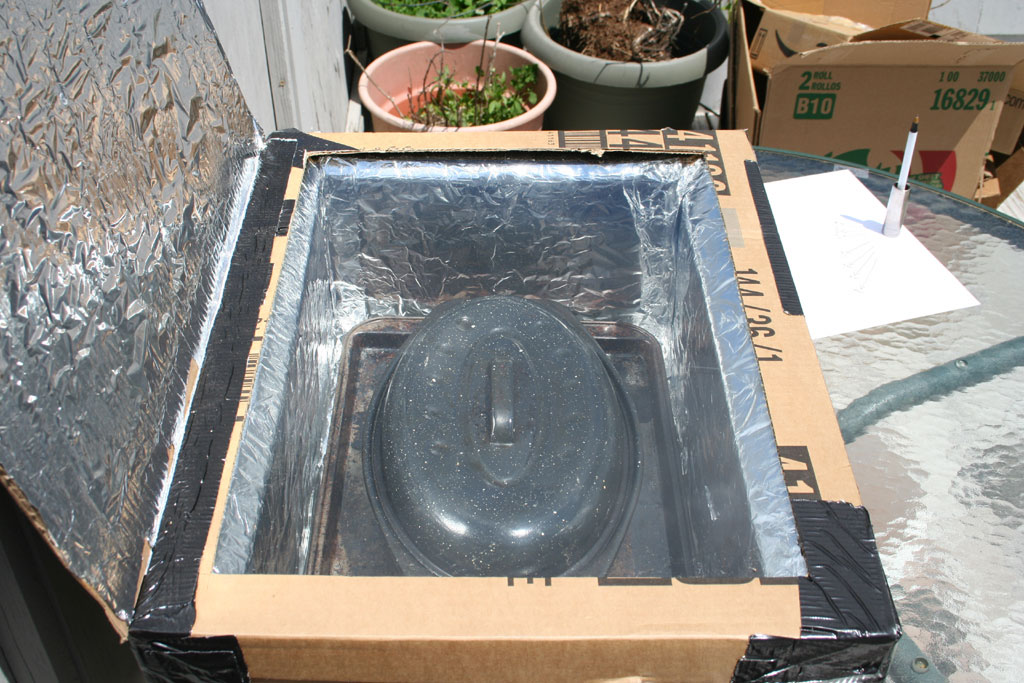 If you’re interested, solarcooking.org has all the information you could want about the topic. They have plans for making ovens – this is the one that I made. I followed all the suggestions for boosting the efficiency – I put foil covered pieces of cardboard in the space between the inner and outer boxes, I made an extra large reflector, and I used a glass top from a window I found on the side of the road instead of using a plastic film top.