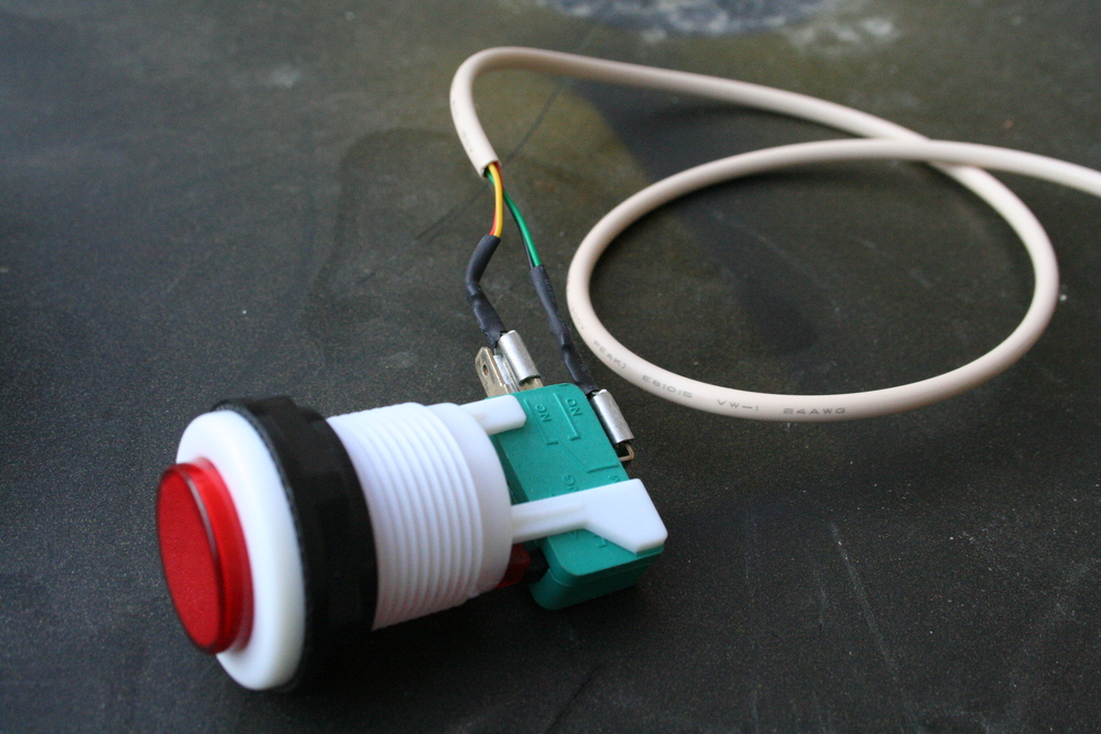 USB on one end, big red arcade-style microswitch on the other. Basically I took the guts out of a USB keyboard and transplanted them into a cassette tape holder to make the whole thing smaller. Note the RJ-11 phone jack for the button cable (just because I have a ton of the jacks laying around, along with the crimping tool and 500′ of telephone wire). The button is made to survive a million smashes and the microswitch itself can be popped out and replaced with no tools when it finally reaches that limit. It also makes a really satisfying click when it’s pressed.