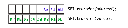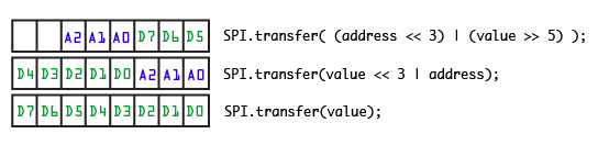 If you look back at the sample Arduino code, you’ll see that they aren’t actually sending that to the chip – mainly because the SPI library only allows you to send 8 bits (aka 1 byte) at a time.. not 11. So the sample code ends up looking like this: